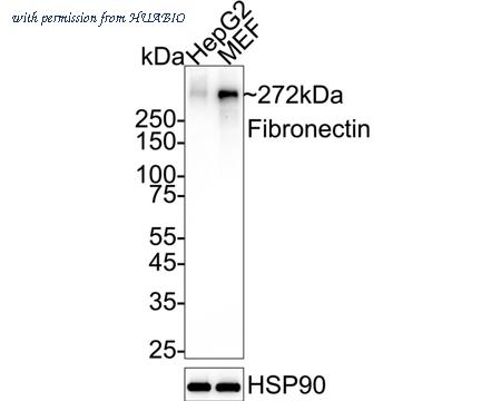 Western blot analysis of Fibronectin on different lysates with Rabbit anti-Fibronectin antibody (HA751514) at 1/5,000 dilution. Lane 1: HepG2 cell lysate Lane 2: NIH/3T3 cell lysate Lysates/proteins at 20 µg/Lane. Predicted band size: 272 kDa Observed band size: 272 kDa Exposure time: 30 seconds; ECL: K1801; 4-20% SDS-PAGE gel. Proteins were transferred to a PVDF membrane and blocked with 5% NFDM/TBST for 1 hour at room temperature. The primary antibody (HA751514) at 1/5,000 dilution was used in primary antibody dilution (K1803) at 4℃ overnight. Goat Anti-Rabbit IgG - HRP Secondary Antibody (HA1001) at 1/50,000 dilution was used for 1 hour at room temperature.
