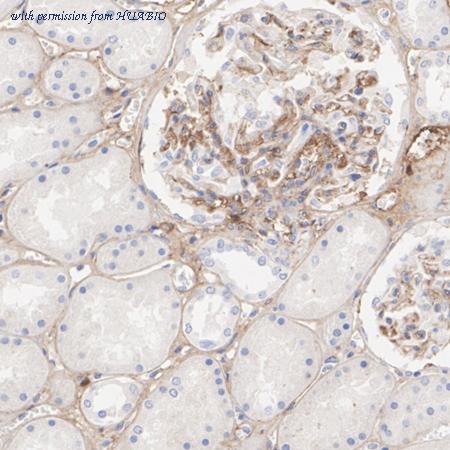 Immunohistochemical analysis of paraffin-embedded human kidney tissue with Rabbit anti-Fibronectin antibody (HA751514) at 1/200 dilution. The section was pre-treated using heat mediated antigen retrieval with Tris-EDTA buffer (pH 9.0) for 20 minutes. The tissues were blocked in 1% BSA for 20 minutes at room temperature, washed with ddH2O and PBS, and then probed with the primary antibody (HA751514) at 1/200 dilution for 1 hour at room temperature. The detection was performed using an HRP conjugated compact polymer system. DAB was used as the chromogen. Tissues were counterstained with hematoxylin and mounted with DPX.
