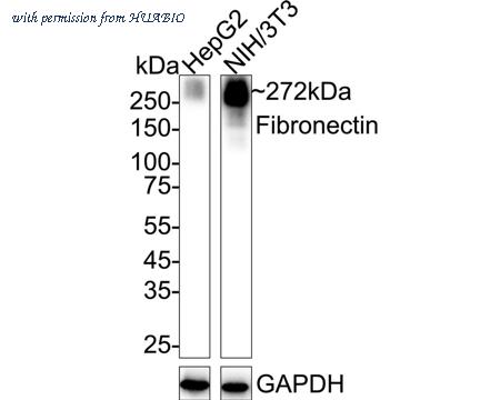 Western blot analysis of Fibronectin on different lysates with Rabbit anti-Fibronectin antibody (HA723611) at 1/5,000 dilution. Lane 1: HepG2 cell lysate Lane 2: NIH/3T3 cell lysate Lysates/proteins at 20 µg/Lane. Predicted band size: 272 kDa Observed band size: 272 kDa Exposure time: 11 seconds; ECL: K1801; 4-20% SDS-PAGE gel. Proteins were transferred to a PVDF membrane and blocked with 5% NFDM/TBST for 1 hour at room temperature. The primary antibody (HA723611) at 1/5,000 dilution was used in primary antibody dilution (K1803) at 4℃ overnight. Goat Anti-Rabbit IgG - HRP Secondary Antibody (HA1001) at 1/50,000 dilution was used for 1 hour at room temperature.