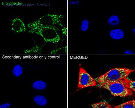 Immunocytochemistry analysis of HepG2 cells labeling Fibronectin with Rabbit anti-Fibronectin antibody (HA723611) at 1/3,000 dilution. Cells were fixed in 4% paraformaldehyde for 15 minutes at room temperature, permeabilized with 0.1% Triton X-100 in PBS for 15 minutes at room temperature, then blocked with 1% BSA in 10% negative goat serum for 1 hour at room temperature. Cells were then incubated with Rabbit anti-Fibronectin antibody (HA723611) at 1/3,000 dilution in 1% BSA in PBST overnight at 4 ℃. Goat Anti-Rabbit IgG H&L (iFluor™ 488, HA1121) was used as the secondary antibody at 1/1,000 dilution. PBS instead of the primary antibody was used as the secondary antibody only control. Nuclear DNA was labelled in blue with DAPI. Beta tubulin (HA601187, red) was stained at 1/100 dilution overnight at +4℃. Goat Anti-Mouse IgG H&L (iFluor™ 594, HA1126) was used as the secondary antibody at 1/1,000 dilution.