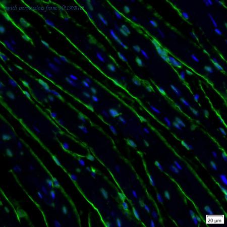 mIHC analysis of mouse heart tissue (Formalin/PFA-fixed paraffin-embedded sections) with Rabbit anti-Fibronectin antibody (IRS144RB) at 1/100 dilution. The immunostaining was performed with the IRISKitCmTSA Kit (900808). Heat mediated antigen retrieval with Tris-EDTA buffer (pH 9.0) for 30 mins at 95℃. DAPI (blue) was used as a nuclear counter stain. Image acquisition was performed with Olympus VS200 Slide Scanner.