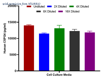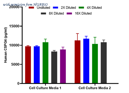 Interpolated concentrations of spiked CSPG4 in human cell culture media samples. The concentrations of CSPG4 were measured in duplicates, interpolated from the CSPG4 standard curves and corrected for sample dilution. Undiluted samples are as follows: cell culture media 50%. The interpolated dilution factor corrected values are plotted (mean +/- SD, n=2).