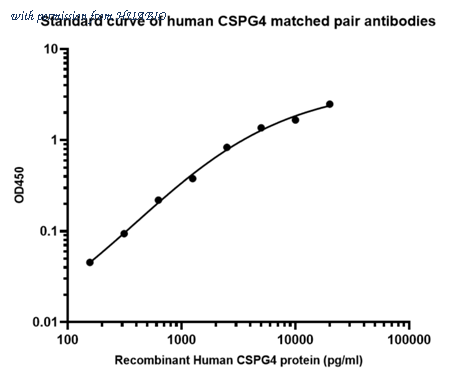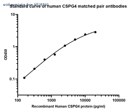 Sandwich ELISA analysis of Human CSPG4 matched pair antibodies Elisa assay was performed by coating wells of a 96-well plate with 50 µl per well of capture antibody (HA723244) diluted in carbonate/bicarbonate buffer, at a concentration of 5 µg/mL overnight at 4℃. Wells of the plate were washed, blocked with 150 µl 0.05% tween-20 1% BSA blocking buffer, and incubated with serial diluted Recombinant Human CSPG4 protein (HA211047) starting from 20,000 pg/ml to 0 pg/ml and detect antibody (HA723246, Biotin, 0.2 µg/ml) for 1 hour at 30℃ with shaking. Then the plate was washed and incubated with 50 µl per well of SA-HRP for 0.5 hour at 30℃ with shaking. Detection was performed using an Ultra TMB Substrate for 10 minutes at room temperature in the dark. The reaction was stopped with sulfuric acid and absorbances were read on a spectrophotometer at 450 nm.