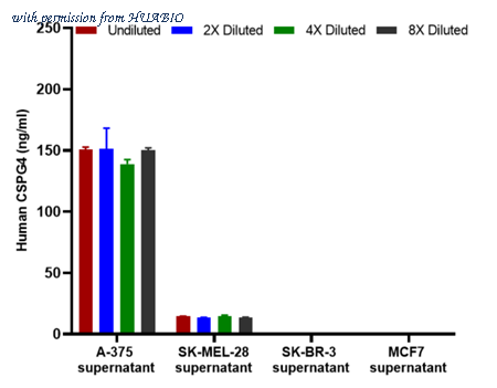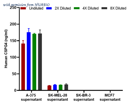 Interpolated concentrations of native CSPG4 in A-375, SK-MEL-28, SK-BR-3 and MCF7 cell culture supernatant. The concentrations of CSPG4 were measured in duplicates, interpolated from the CSPG4 standard curve and corrected for sample dilution. Undiluted samples are A-375 cell culture supernatant 25%, SK-MEL-28 cell culture supernatant 100%, SK-BR-3 cell culture supernatant 100% and MCF7 cell culture supernatant 100%. The interpolated dilution factor corrected values are plotted (mean +/- SD, n=2). The mean CSPG4 concentration was determined to be 164.9 ng/ml in A-375 cell culture supernatant, 17.2 ng/ml in SK-MEL-28 cell culture supernatant and undetectable in SK-BR-3 and MCF7 cell culture supernatant.