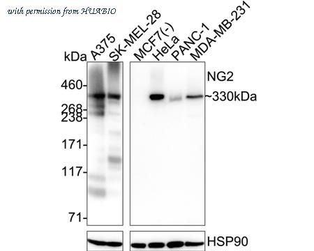 Western blot analysis of NG2 on different lysates with Rabbit anti-NG2 antibody (HA723167) at 1/10,000 dilution. Lane 1: A375 cell lysate Lane 2: SK-MEL-28 cell lysate Lane 3: MCF7 cell lysate (negative) Lane 4: HeLa cell lysate Lane 5: PANC-1 cell lysate Lane 6: MDA-MB-231 cell lysate Lysates/proteins at 20 µg/Lane. Predicted band size: 251 kDa Observed band size: $330 kDa Exposure time: Lane 1-2: 6 seconds; Lane 3-6: 59 seconds; ECL: K1801; 3-8% SDS-PAGE gel. Proteins were transferred to a PVDF membrane and blocked with 5% NFDM/TBST for 1 hour at room temperature. The primary antibody (HA723167) at 1/10,000 dilution was used in 5% NFDM/TBST at 4℃ overnight. Goat Anti-Rabbit IgG - HRP Secondary Antibody (HA1001) at 1/50,000 dilution was used for 1 hour at room temperature.