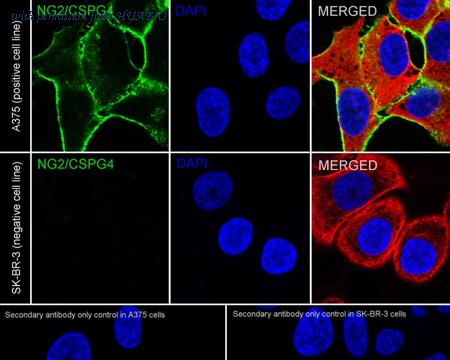 Immunocytochemistry analysis of A375 (positive) and SK-Br-3 (negative) labeling NG2 with Rabbit anti-NG2 antibody (HA751329) at 1/100 dilution. Cells were fixed in 4% paraformaldehyde for 15 minutes at room temperature, permeabilized with 0.1% Triton X-100 in PBS for 15 minutes at room temperature, then blocked with 1% BSA in 10% negative goat serum for 1 hour at room temperature. Cells were then incubated with Rabbit anti-NG2 antibody (HA751329) at 1/100 dilution in 1% BSA in PBST overnight at 4 ℃. Goat Anti-Rabbit IgG H&L (iFluor™ 488, HA1121) was used as the secondary antibody at 1/1,000 dilution. PBS instead of the primary antibody was used as the secondary antibody only control. Nuclear DNA was labelled in blue with DAPI. Beta tubulin (HA601187, red) was stained at 1/100 dilution overnight at +4℃. Goat Anti-Mouse IgG H&L (iFluor™ 594, HA1126) was used as the secondary antibody at 1/1,000 dilution.