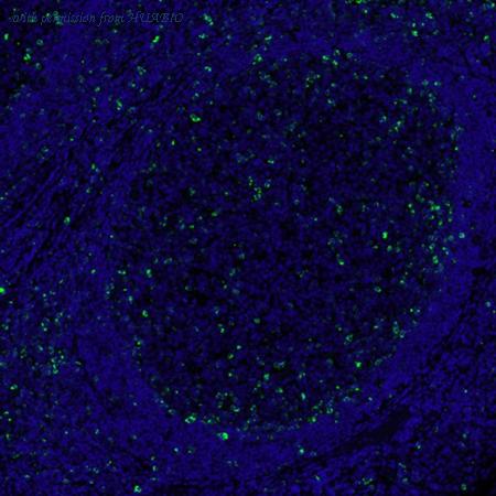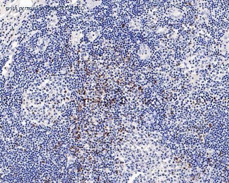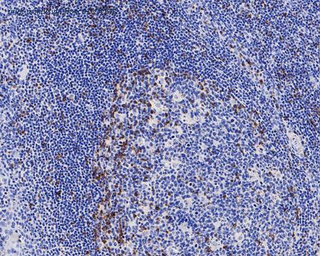 Immunohistochemical analysis of paraffin-embedded human lymph nodes tissue with Rabbit anti-CTLA-4 antibody (HA750581) at 1/1,000 dilution. The section was pre-treated using heat mediated antigen retrieval with Tris-EDTA buffer (pH 9.0) for 20 minutes. The tissues were blocked in 1% BSA for 20 minutes at room temperature, washed with ddH2O and PBS, and then probed with the primary antibody (HA750581) at 1/1,000 dilution for 1 hour at room temperature. The detection was performed using an HRP conjugated compact polymer system. DAB was used as the chromogen. Tissues were counterstained with hematoxylin and mounted with DPX.