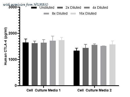 Interpolated concentrations of spiked CTLA-4 in cell culture media samples. The concentrations of CTLA-4 were measured in duplicates, interpolated from the CTLA-4 standard curves and corrected for sample dilution. Undiluted samples are as follows: cell culture media 50%. The interpolated dilution factor corrected values are plotted (mean +/- SD, n=2).