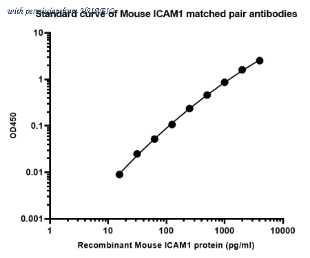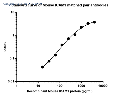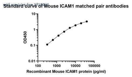Sandwich ELISA analysis of Mouse ICAM1 matched pair antibodies Capture: HA723832, Mouse ICAM1 Rabbit mAb [PSH16-34] Detector: HA723833, Mouse ICAM1 Rabbit mAb [PSH16-35] Elisa assay was performed by coating wells of a 96-well plate with 100 µl per well of capture antibody (HA723832) diluted in carbonate/bicarbonate buffer, at a concentration of 2 µg/mL overnight at 4℃. Wells of the plate were washed, blocked with 150 µl 0.05% tween-20 1% BSA blocking buffer, and incubated with serial diluted Recombinant Mouse ICAM1 protein (HA211066) starting from 4,000 pg/ml to 0 pg/ml and detect antibody (HA723833, Biotin, 0.2 µg/ml) for 1 hour at 30℃ with shaking. Then the plate was washed and incubated with 100 µl per well of SA-HRP for 0.5 hour at 30℃ with shaking. Detection was performed using an Ultra TMB Substrate for 10 minutes at room temperature in the dark. The reaction was stopped with sulfuric acid and absorbances were read on a spectrophotometer at 450 nm.