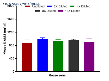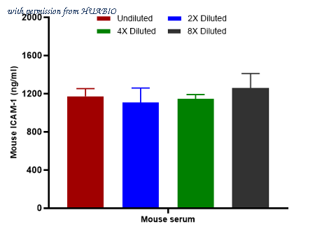 Interpolated concentrations of native ICAM-1 in mouse serum samples. Capture: HA723834, Mouse ICAM1 Rabbit mAb [PSH16-36] Detector: HA723833, Mouse ICAM1 Rabbit mAb [PSH16-35] The concentrations of ICAM-1 were measured in duplicates, interpolated from the ICAM-1 standard curve and corrected for sample dilution. Undiluted samples are mouse serum 0.125%. The interpolated dilution factor corrected values are plotted (mean +/- SD, n=2). The mean ICAM-1 concentration was determined to be 1,171 ng/ml in mouse serum.