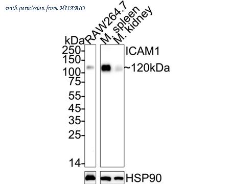 Western blot analysis of ICAM1 on different lysates with Rabbit anti-ICAM1 antibody (ER1910-98) at 1/5,000 dilution. Lane 1: Mouse spleen tissue lysate Lane 2: Rat kidney tissue lysate Lane 3: Rat spleen tissue lysate Lysates/proteins at 15 µg/Lane. Predicted band size: 60 kDa Observed band size: 75-120 kDa Exposure time: 4 seconds; ECL: K1801; 4-20% SDS-PAGE gel. Proteins were transferred to a PVDF membrane and blocked with 5% NFDM/TBST for 1 hour at room temperature. The primary antibody (ER1910-98) at 1/5,000 dilution was used in primary antibody dilution (K1803) at 4℃ overnight. Goat Anti-Rabbit IgG - HRP Secondary Antibody (HA1001) at 1/50,000 dilution was used for 1 hour at room temperature.