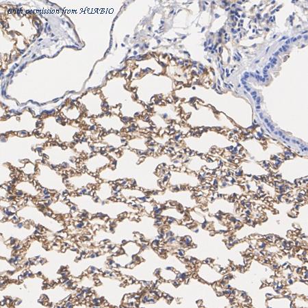 Immunohistochemical analysis of paraffin-embedded mouse lung tissue with Rabbit anti-ICAM1 antibody (HA722417) at 1/10,000 dilution. The section was pre-treated using heat mediated antigen retrieval with Tris-EDTA buffer (pH 9.0) for 20 minutes. The tissues were blocked in 1% BSA for 20 minutes at room temperature, washed with ddH2O and PBS, and then probed with the primary antibody (HA722417) at 1/10,000 dilution for 1 hour at room temperature. The detection was performed using an HRP conjugated compact polymer system. DAB was used as the chromogen. Tissues were counterstained with hematoxylin and mounted with DPX.