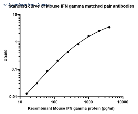 Sandwich ELISA analysis of Mouse IFN gamma matched pair antibodies Elisa assay was performed by coating wells of a 96-well plate with 100 µl per well of capture antibody (HA721956) diluted in carbonate/bicarbonate buffer, at a concentration of 2 µg/mL overnight at 4℃. Wells of the plate were washed, blocked with 150 µl 0.05% tween-20 1%BSA blocking buffer, and incubated with serial diluted Mouse IFN gamma protein starting from 2000 pg/ml to 0 pg/ml and detect antibody-Biotin (0.2 µg/ml) for 1 hour at 30℃ with shaking. Then the plate was washed and incubated with 100 µl per well of SA-HRP for 0.5 hour at 30℃ with shaking. Detection was performed using an Ultra TMB Substrate for 10 minutes at room temperature in the dark. The reaction was stopped with sulfuric acid and absorbances were read on a spectrophotometer at 450 nm.