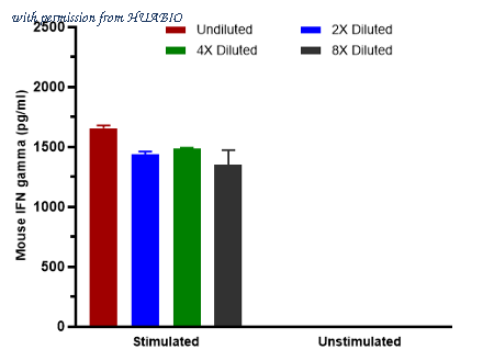 Interpolated concentrations of native IFN gamma in mouse spleen samples treated with or without 5 µg/ml LPS for 6 days. Capture: HA723676, Mouse IFN gamma Rabbit mAb [PSH14-80] Detector: HA723677, Mouse IFN gamma Rabbit mAb [PSH14-81] The concentrations of IFN gamma measured in duplicate and interpolated from the IFN gamma standard curve and corrected for sample dilution. Undiluted samples are as follows: unstimulated 100% and stimulated 50%. The interpolated dilution factor corrected values are plotted (mean +/- SD, n=2). The mean IFN gamma concentration was determined to be 1,481 pg/ml in LPS stimulated mouse spleen supernatant and undetectable in the unstimulated mouse spleen supernatant.