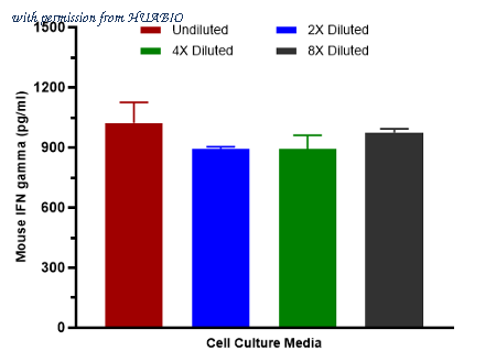Interpolated concentrations of spiked IFN gamma in mouse cell culture media samples. Capture: HA723676, Mouse IFN gamma Rabbit mAb [PSH14-80] Detector: HA723677, Mouse IFN gamma Rabbit mAb [PSH14-81] The concentrations of IFN gamma were measured in duplicates, interpolated from the IFN gamma standard curves and corrected for sample dilution. Undiluted samples are as follows: cell culture media 50%. The interpolated dilution factor corrected values are plotted (mean +/- SD, n=2).