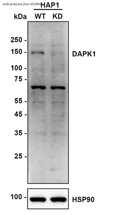 Western blot analysis of DAP Kinase 1 on different lysates with Mouse anti-DAP Kinase 1 antibody (EM1801-15) at 1/1,000 dilution. Lane 1: HAP1-parental cell lysate Lane 2: HAP1-DAP Kinase 1 KD cell lysate Lysates/proteins at 10 µg/Lane. Predicted band size: 150 kDa Observed band size: 150 kDa Exposure time: 15 seconds; ECL: K1802; 4-20% SDS-PAGE gel. Proteins were transferred to a PVDF membrane and blocked with 5% NFDM/TBST for 1 hour at room temperature. The primary antibody (EM1801-15) at 1/1,000 dilution was used in K1803 at 4℃ overnight. Goat Anti-Mouse IgG - HRP Secondary Antibody (HA1006) at 1/50,000 dilution was used for 1 hour at room temperature.