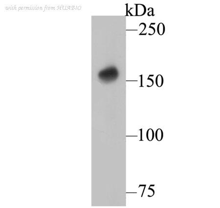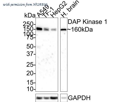 Western blot analysis of DAP Kinase 1 on different lysates with Mouse anti-DAP Kinase 1 antibody (HA610051) at 1/2,000 dilution. Lane 1: A549 cell lysate (30 µg/Lane) Lane 2: TF-1 cell lysate (30 µg/Lane) Lane 3: HepG2 cell lysate (30 µg/Lane) Lane 4: Human brain tissue lysate (30 µg/Lane) Predicted band size: 160 kDa Observed band size: 160 kDa Exposure time: 2 minutes; ECL: K1801; 4-20% SDS-PAGE gel. Proteins were transferred to a PVDF membrane and blocked with 5% NFDM/TBST for 1 hour at room temperature. The primary antibody (HA610051) at 1/2,000 dilution was used in 5% NFDM/TBST at room temperature for 2 hours. Goat Anti-Mouse IgG - HRP Secondary Antibody (HA1006) at 1/100,000 dilution was used for 1 hour at room temperature.