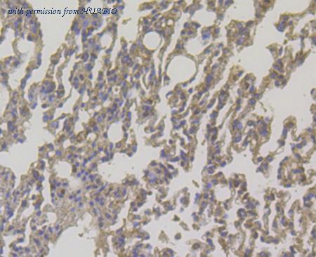 Immunohistochemical analysis of paraffin-embedded rat lung tissue using anti-DAP Kinase 1 antibody. The section was pre-treated using heat mediated antigen retrieval with Tris-EDTA buffer (pH 8.0-8.4) for 20 minutes.The tissues were blocked in 5% BSA for 30 minutes at room temperature, washed with ddH2O and PBS, and then probed with the antibody (EM1801-15) at 1/50 dilution, for 30 minutes at room temperature and detected using an HRP conjugated compact polymer system. DAB was used as the chrogen. Counter stained with hematoxylin and mounted with DPX.