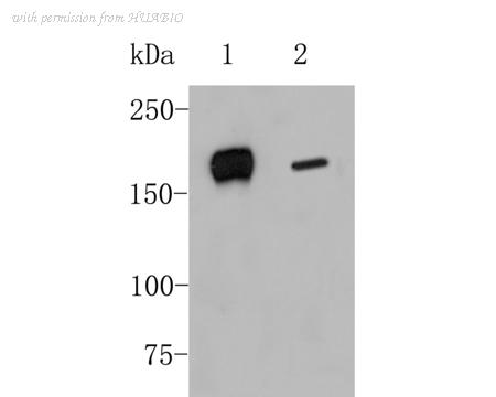 Western blot analysis of DAP Kinase 1 on different lysates. Proteins were transferred to a PVDF membrane and blocked with 5% BSA in PBS for 1 hour at room temperature. The primary antibody (EM1902-25, 1/500) was used in 5% BSA at room temperature for 2 hours. Goat Anti-Mouse IgG - HRP Secondary Antibody (HA1006) at 1:5,000 dilution was used for 1 hour at room temperature. Positive control: Lane 1: Human skin tissue lysate Lane 2: Human skeletal muscle tissue lysate