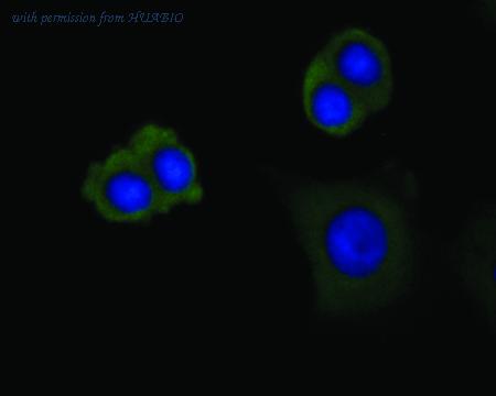 ICC staining of DAP Kinase 1 in MCF-7 cells (green). Formalin fixed cells were permeabilized with 0.1% Triton X-100 in TBS for 10 minutes at room temperature and blocked with 1% Blocker BSA for 15 minutes at room temperature. Cells were probed with the primary antibody (EM1902-25, 1/50) for 1 hour at room temperature, washed with PBS. Alexa Fluor®488 Goat anti-Mouse IgG was used as the secondary antibody at 1/100 dilution. The nuclear counter stain is DAPI (blue).