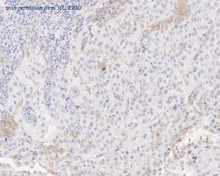 Immunohistochemical analysis of paraffin-embedded human lung carcinoma tissue with Mouse anti-DAP Kinase 1 antibody (HA610051) at 1/2,000 dilution. The section was pre-treated using heat mediated antigen retrieval with Tris-EDTA buffer (pH 9.0) for 20 minutes. The tissues were blocked in 1% BSA for 20 minutes at room temperature, washed with ddH2O and PBS, and then probed with the primary antibody (HA610051) at 1/2,000 dilution for 1 hour at room temperature. The detection was performed using an HRP conjugated compact polymer system. DAB was used as the chromogen. Tissues were counterstained with hematoxylin and mounted with DPX.