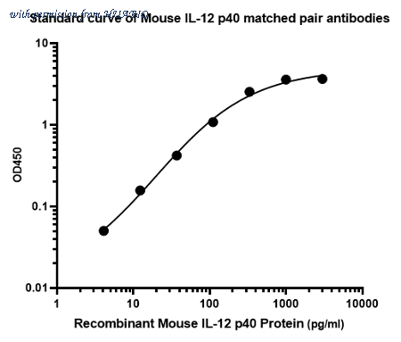 Sandwich ELISA analysis of Mouse IL-12p40 matched pair antibodies Elisa assay was performed by coating wells of a 96-well plate with 100 µl per well of capture antibody (HA722193) diluted in carbonate/bicarbonate buffer, at a concentration of 5 µg/ml overnight at 4℃. Wells of the plate were washed, blocked with 150 µl 0.05% tween-20 1%BSA blocking buffer, and incubated with serial diluted Recombinant mouse IL-12p40 protein (HA210890) starting from 3000 pg/ml to 0 pg/ml and detect antibody (HA722194, Biotin, 0.2 µg/ml) for 1 hour at 30℃ with shaking. Then the plate was washed and incubated with 100 µl per well of SA-HRP for 0.5 hour at 30℃ with shaking. Detection was performed using an Ultra TMB Substrate for 10 minutes at room temperature in the dark. The reaction was stopped with sulfuric acid and absorbances were read on a spectrophotometer at 450 nm.