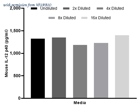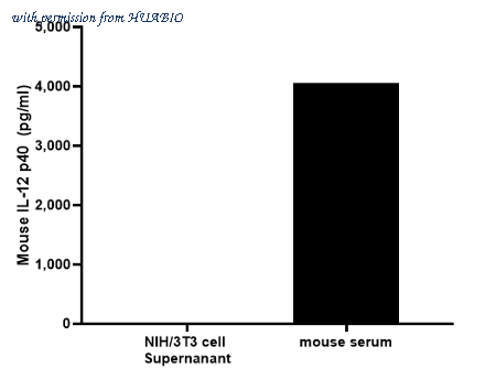 Interpolated concentrations of native IL-12 p40 in cell culture supernatant and mouse serum samples. IL-12 p40 was measured in 100% cell supernatant. The concentrations of IL-12 p40 were interpolated from the IL-12 p40 standard curves. The mean IL-12 p40 concentration was determined to be 4055 pg/mL in mouse serum. There was no detectable signal in NIH/3T3 cell supernatant.
