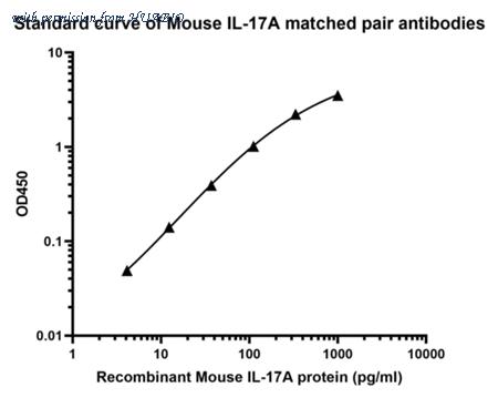 Sandwich ELISA analysis of Mouse IL-17A matched pair antibodies Capture: HA722264, Mouse IL-17A Rabbit mAb [PSH05-35] Detector: HA722265, Mouse IL-17A Rabbit mAb [PSH05-36] Elisa assay was performed by coating wells of a 96-well plate with 100 µl per well of capture antibody (HA722264) diluted in carbonate/bicarbonate buffer, at a concentration of 2 µg/mL overnight at 4℃. Wells of the plate were washed, blocked with 150 µl 0.05% tween-20 1%BSA blocking buffer, and incubated with serial diluted recombinant standard Mouse IL-17A protein (HA210791) starting from 800 pg/ml to 0 pg/ml and detect antibody (HA722265, Biotin, 0.2 µg/ml) for 1 hour at 30℃ with shaking. Then the plate was washed and incubated with 100 µl per well of SA-HRP for 0.5 hour at 30℃ with shaking. Detection was performed using an Ultra TMB Substrate for 10 minutes at room temperature in the dark. The reaction was stopped with sulfuric acid and absorbances were read on a spectrophotometer at 450 nm.
