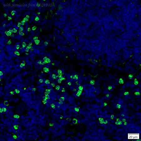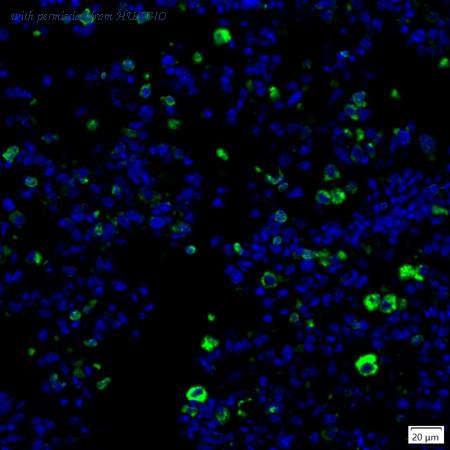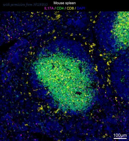 mIHC analysis of mouse spleen tissue (Formalin/PFA-fixed paraffin-embedded sections) with Rabbit anti-IL-17A antibody (IRS056) at 1/100 dilution. The immunostaining was performed with the IRISKitCmTSA Kit (900808). Heat mediated antigen retrieval with Tris-EDTA buffer (pH 9.0) for 30 mins at 95℃. DAPI (blue) was used as a nuclear counter stain. Image acquisition was performed with Olympus VS200 Slide Scanner.