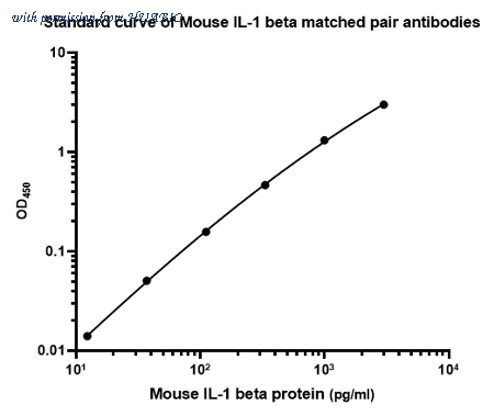 Sandwich ELISA analysis of Mouse IL-1β matched pair antibodies Elisa assay was performed by coating wells of a 96-well plate with 100 µl per well of capture antibody (HA722166) diluted in carbonate/bicarbonate buffer, at a concentration of 2 µg/ml overnight at 4℃. Wells of the plate were washed, blocked with 150 µl 0.05% tween-20 1%BSA blocking buffer, and incubated with serial diluted Recombinant Mouse IL-1β protein (HA210706) starting from 2000 pg/ml to 0 pg/ml and detect antibody (HA722167, Biotin, 0.2 µg/ml) for 1 hour at 30℃ with shaking. Then the plate was washed and incubated with 100 µl per well of SA-HRP for 0.5 hour at 30℃ with shaking. Detection was performed using an Ultra TMB Substrate for 10 minutes at room temperature in the dark. The reaction was stopped with sulfuric acid and absorbances were read on a spectrophotometer at 450 nm.