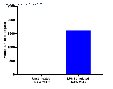 The concentrations of IL-1β were interpolated from the IL-1β standard curve and corrected for sample dilution. The mean IL-1β concentration were determined to be 27pg/mL and 1,615 pg/mL in unstimuated and LPS stimulated Raw264.7 cell extract.