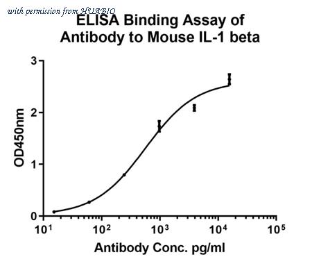 Indirect ELISA analysis of Mouse IL-1 beta was performed by coating wells of a 96-well plate with 50 µL per well of Mouse IL-1 beta-BSA diluted in carbonate/bicarbonate buffer, at a concentration of 1 µg/mL overnight at 4℃. Wells of the plate were washed, blocked with 1%BSA blocking buffer for 1 hour at 37℃, and incubated with 50 µL per well of Mouse IL-1 beta monoclonal antibody serial diluted starting from a concentration of 1µg/mL for 45 minutes at 37℃. The plate was washed and incubated with 50 µL per well of an HRP-conjugated goat anti-rabbit IgG secondary antibody at a dilution of 1/80,000 for 30 minutes at 37℃. Detection was performed using an Ultra TMB Substrate for 10 minutes at 37℃ in the dark. The reaction was stopped with sulfuric acid and absorbances were read on a spectrophotometer at 450 nm.