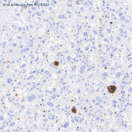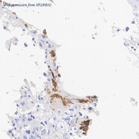 Immunohistochemical analysis of paraffin-embedded mouse placenta tissue with Rabbit anti-CD41 antibody (HA751201) at 1/1,000 dilution. The section was pre-treated using heat mediated antigen retrieval with Tris-EDTA buffer (pH 9.0) for 20 minutes. The tissues were blocked in 1% BSA for 20 minutes at room temperature, washed with ddH2O and PBS, and then probed with the primary antibody (HA751201) at 1/1,000 dilution for 1 hour at room temperature. The detection was performed using an HRP conjugated compact polymer system. DAB was used as the chromogen. Tissues were counterstained with hematoxylin and mounted with DPX.