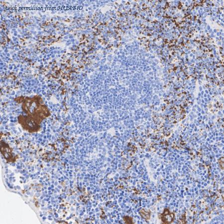 Immunohistochemical analysis of paraffin-embedded mouse spleen tissue with Rabbit anti-CD41 antibody (HA722938) at 1/1,000 dilution. The section was pre-treated using heat mediated antigen retrieval with Tris-EDTA buffer (pH 9.0) for 20 minutes. The tissues were blocked in 1% BSA for 20 minutes at room temperature, washed with ddH2O and PBS, and then probed with the primary antibody (HA722938) at 1/1,000 dilution for 1 hour at room temperature. The detection was performed using an HRP conjugated compact polymer system. DAB was used as the chromogen. Tissues were counterstained with hematoxylin and mounted with DPX.