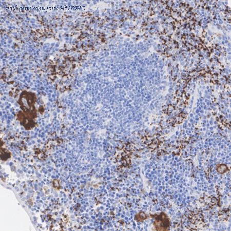 Immunohistochemical analysis of paraffin-embedded human spleen tissue with Rabbit anti-CD41 antibody (HA751203) at 1/1,000 dilution. The section was pre-treated using heat mediated antigen retrieval with Tris-EDTA buffer (pH 9.0) for 20 minutes. The tissues were blocked in 1% BSA for 20 minutes at room temperature, washed with ddH2O and PBS, and then probed with the primary antibody (HA751203) at 1/1,000 dilution for 1 hour at room temperature. The detection was performed using an HRP conjugated compact polymer system. DAB was used as the chromogen. Tissues were counterstained with hematoxylin and mounted with DPX.