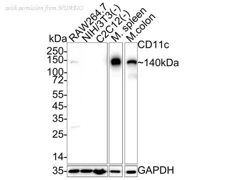 Western blot analysis of CD11c on different lysates with Rabbit anti-CD11c antibody (HA722830) at 1/1,000 dilution. Lane 1: RAW264.7 cell lysate (20 µg/Lane) Lane 2:NIH/3T3 cell lysate (negative) (20 µg/Lane) Lane 3: C2C12 cell lysate (negative) (20 µg/Lane) Lane 4: Mouse spleen tissue lysate (30 µg/Lane) Lane 5: Mouse colon tissue lysate (30 µg/Lane) Predicted band size: 129 kDa Observed band size: 140 kDa Exposure time: Lane1-3: 3 minutes ; Lane 4-5: 25 seconds;ECL: K1801; 4-20% SDS-PAGE gel. Proteins were transferred to a PVDF membrane and blocked with 5% NFDM/TBST for 1 hour at room temperature. The primary antibody (HA722830) at 1/1,000 dilution was used in 5% NFDM/TBST at 4℃ overnight. Goat Anti-Rabbit IgG - HRP Secondary Antibody (HA1001) at 1/50,000 dilution was used for 1 hour at room temperature.