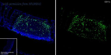 Immunofluorescence analysis of frozen mouse colon tissue with Rabbit anti-CD11c antibody (HA751163) at 1/1,000 dilution. The section was not undergone antigen retrieval. The tissues were blocked in 10% negative goat serum for 1 hour at room temperature, washed with PBS, and then probed with the primary antibody (HA751163, green) at 1/1,000 dilution overnight at 4 ℃, washed with PBS. Goat Anti-Rabbit IgG H&L (iFluor™ 488, HA1121) was used as the secondary antibody at 1/1,000 dilution. Nuclei were counterstained with DAPI (blue).
