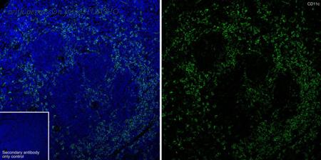 Immunofluorescence analysis of frozen mouse spleen tissue with Rabbit anti-CD11c antibody (HA751163) at 1/500 dilution. The section was not undergone antigen retrieval. The tissues were blocked in 10% negative goat serum for 1 hour at room temperature, washed with PBS, and then probed with the primary antibody (HA751163, green) at 1/500 dilution overnight at 4 ℃, washed with PBS. Goat Anti-Rabbit IgG H&L (iFluor™ 488, HA1121) was used as the secondary antibody at 1/1,000 dilution. Nuclei were counterstained with DAPI (blue).