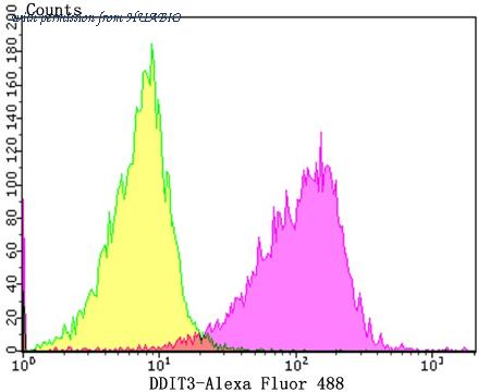 Flow cytometric analysis of HepG2 cells with DDIT3 antibody at 1/50 dilution (fuchsia) compared with an unlabelled control (cells without incubation with primary antibody; yellow). Alexa Fluor 488-conjugated goat anti rabbit IgG was used as the secondary antibody.