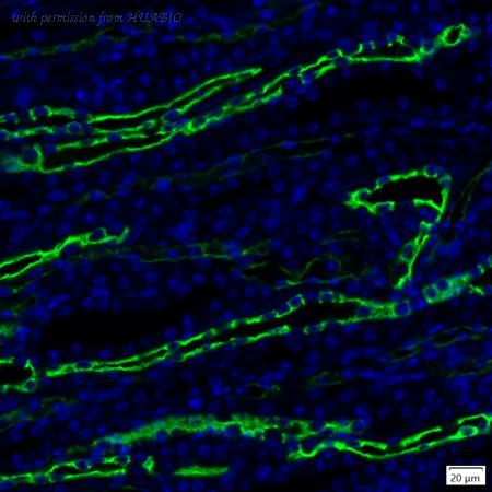 Immunofluorescence analysis of paraffin-embedded human kidney tissue labeling Cytokeratin 18 (HA720139F) and Vimentin (EM0401). The section was pre-treated using heat mediated antigen retrieval with Tris-EDTA buffer (pH 9.0) for 20 minutes. The tissues were blocked in 10% negative goat serum for 1 hour at room temperature, washed with PBS. And then probed with the primary antibodies Cytokeratin 18 (HA720139F, green) at 1/50 dilution and Vimentin (EM0401, red) at 1/1,000 dilution overnight at 4 ℃, washed with PBS. iFluor™ 594 conjugate-Goat anti-Mouse IgG (HA1126) was used as the secondary antibody at 1/1,000 dilution. DAPI was used as nuclear counterstain.