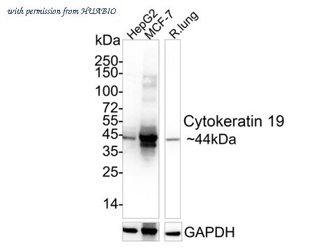 Western blot analysis of Cytokeratin 19 on different lysates with Rabbit anti-Cytokeratin 19 antibody (ET1601-6) at 1/2,000 dilution. Lane 1: HepG2 cell lysate Lane 2: MCF-7 cell lysate Lane 3: Rat lung tissue lysate Lysates/proteins at 20 µg/Lane. Predicted band size: 44 kDa Observed band size: 44 kDa Exposure time: 9 seconds; ECL: K1801; 4-20% SDS-PAGE gel. Proteins were transferred to a PVDF membrane and blocked with 5% NFDM/TBST for 1 hour at room temperature. The primary antibody (ET1601-6) at 1/2,000 dilution was used in 5% NFDM/TBST at 4℃ overnight. Goat Anti-Rabbit IgG - HRP Secondary Antibody (HA1001) at 1/50,000 dilution was used for 1 hour at room temperature.
