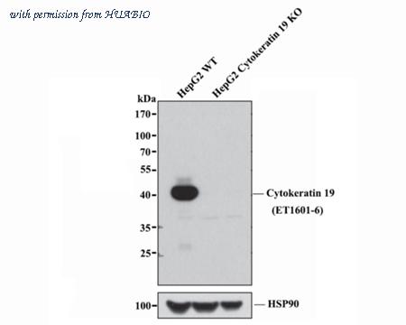 Western blot analysis of Cytokeratin 19 with anti-Cytokeratin 19 antibody [SA30-06] (ET1601-6) at 1/5,000 dilution. Lane 1: Wild-type HepG2 whole cell lysate (20 µg). Lane 2/3: Cytokeratin 19 knockout HepG2 whole cell lysate (20 µg). Proteins were transferred to a PVDF membrane and blocked with 5% NFDM in TBST for 1 hour at room temperature. The primary Anti-Cytokeratin 19 Antibody (ET1601-6, 1/5,000) and anti-HSP90 antibody (ET1605-56, 1/10,000) were used in 5% BSA at room temperature for 2 hours. Goat Anti-Rabbit IgG H&L (HRP) Secondary Antibody (HA1001) at 1/200,000 dilution was used for 1 hour at room temperature.
