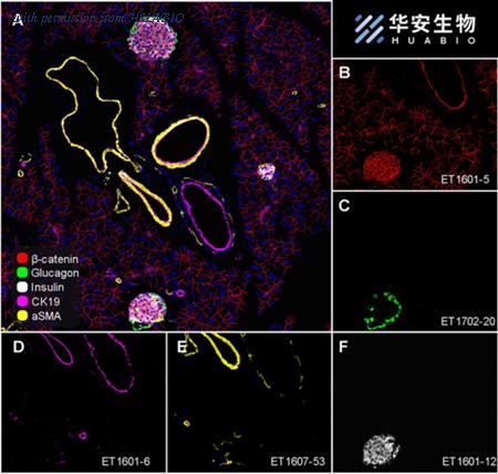 Fluorescence multiplex immunohistochemical analysis of mouse pancreas (Formalin/PFA-fixed paraffin-embedded sections). Panel A: the merged image of anti-β-catenin (ET1601-5, Red), anti-Glucagon (ET1702-20, Green), anti-Insulin (ET1601-12, White), anti-CK19 (ET1601-6, Magenta) and anti-aSMA (ET1607-53, Yellow) on mouse pancreas. HRP Conjugated UltraPolymer Goat Polyclonal Antibody HA1119/HA1120 was used as a secondary antibody. The immunostaining was performed with the Sequential Immuno-staining Kit (IRISKit™MH010101, www.luminiris.cn). The section was incubated in five rounds of staining: in the order of ET1601-5 (1/2,000 dilution), ET1702-20 (1/6,000 dilution), ET1601-12 (1/8,000 dilution), ET1601-6 (1/5,000 dilution) and ET1607-53 (1/10,000 dilution) for 20 mins at room temperature. Each round was followed by a separate fluorescent tyramide signal amplification system. Heat mediated antigen retrieval with Tris-EDTA buffer (pH 9.0) for 30 mins at 95℃. DAPI (blue) was used as a nuclear counter stain. Image acquisition was performed with Olympus VS200 Slide Scanner.