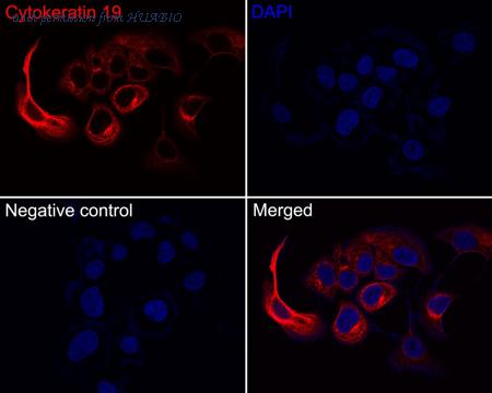 Immunocytochemistry analysis of SK-Br-3 cells labeling Cytokeratin 19. Cells were fixed in 4% paraformaldehyde and permeabilized with 0.05% Triton X-100 in PBS for 10 minutes, and then blocked with 2% negative goat serum for 15 minutes at room temperature. The cells were then incubated overnight at +4℃ with HA720115F at 1/50 dilution Rabbit monoclonal to Cytokeratin 19 (iFluor™ 594)(shown in red). DAPI was used as nuclear counterstain.