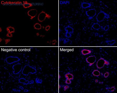 Immunofluorescence analysis of paraffin-embedded human breast tissue labeling Cytokeratin 19 (HA720115F). The section was pre-treated using heat mediated antigen retrieval with Tris-EDTA buffer (pH 9.0) for 20 minutes. The tissues were blocked in 10% negative goat serum for 1 hour at room temperature, washed with PBS. And then probed with the primary antibody Cytokeratin 19 (HA720115F, iFluor™ 594) at 1/100 dilution overnight at 4 ℃, washed with PBS. DAPI was used as nuclear counterstain.