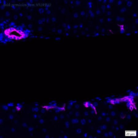 mIHC analysis of mouse liver tissue (Formalin/PFA-fixed paraffin-embedded sections) with Rabbit anti-Cytokeratin 19 antibody (IRS225RB) at 1/100 dilution. The immunostaining was performed with the IRISKitCmTSA Kit (900808). Heat mediated antigen retrieval with Tris-EDTA buffer (pH 9.0) for 30 mins at 95℃. DAPI (blue) was used as a nuclear counter stain. Image acquisition was performed with Olympus VS200 Slide Scanner.