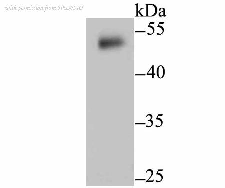 Western blot analysis of Cytokeratin 8 on different lysates with Rabbit anti-Cytokeratin 8 antibody (HA750145) at 1/1,000 dilution. Lane 1: Hela cell lysate (10 µg/Lane) Lane 2: A431 cell lysate (10 µg/Lane) Predicted band size: 54 kDa Observed band size: 54 kDa Exposure time: 30 seconds; 10% SDS-PAGE gel. Proteins were transferred to a PVDF membrane and blocked with 5% NFDM/TBST for 1 hour at room temperature. The primary antibody (HA750145) at 1/1,000 dilution was used in 5% NFDM/TBST at room temperature for 2 hours. Goat Anti-Rabbit IgG - HRP Secondary Antibody (HA1001) at 1:300,000 dilution was used for 1 hour at room temperature.