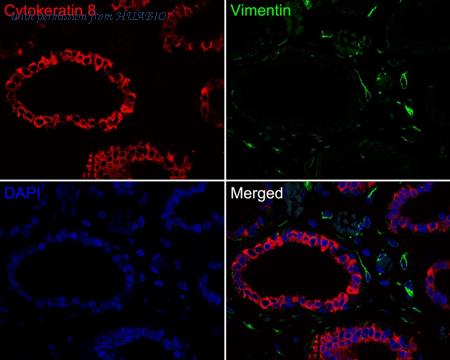 Immunofluorescence analysis of paraffin-embedded human breast tissue labeling Cytokeratin 8 (HA720145F) and Vimentin (EM0401). The section was pre-treated using heat mediated antigen retrieval with Tris-EDTA buffer (pH 9.0) for 20 minutes. The tissues were blocked in 10% negative goat serum for 1 hour at room temperature, washed with PBS. And then probed with the primary antibodies Cytokeratin 8 (HA720145F, red) at 1/200 dilution and Vimentin (EM0401, green) at 1/1,000 dilution overnight at 4 ℃, washed with PBS. iFluor™ 488 conjugate-Goat anti-Mouse IgG (HA1125) was used as the secondary antibody at 1/1,000 dilution. DAPI was used as nuclear counterstain.