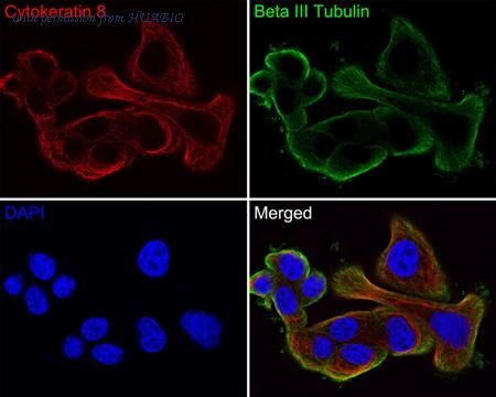 Immunocytochemistry analysis of SK-Br-3 cells labeling Cytokeratin 8 with Rabbit anti-Cytokeratin 8 antibody (HA720145F) at 1/100 dilution. Cells were fixed in 4% paraformaldehyde for 15 minutes, permeabilized with 0.1% Triton X-100 in PBS for 15 minutes, and then blocked with 2% normal goat serum for 1 hour at 37℃. Cells were then incubated with Rabbit anti-Cytokeratin 8 antibody (HA720145F, red) at 1/100 dilution in 2% normal goat serum overnight at 4 ℃. Nuclear DNA was labelled in blue with DAPI. Beta III Tubulin (M0805-8, green) was stained at 1/200 dilution overnight at +4℃. Goat Anti-Mouse IgG H&L (iFluor™ 488, HA1125) was used as the secondary antibody at 1/800 dilution.