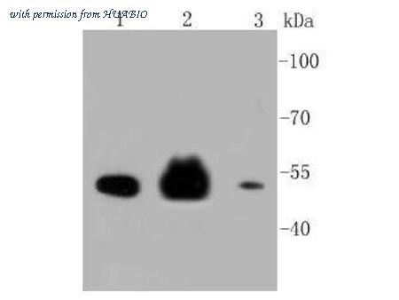Western blot analysis on different cell lysates using anti-Cytokeratin 8 Mouse mAb. Positive control: Lane 1: A549 Lane 2: MCF-7 Lane 3: PC12
